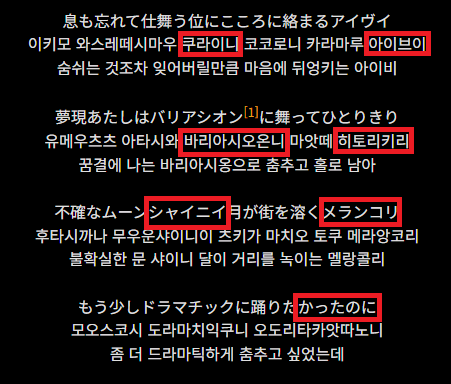 그러고 나선 하이라이트로 넘어가는데, 보시는 것처럼 원본 가사에서도 칸리-(관리)와 발음적으로 엮을 수 있는 단어를 라임으로 하이라이트를 구성하고 있습니다. 이런 연결성으로 인해 소재를 선정한 것으로 생각되는데, 상당히 센스 있는 이유 아닐까 싶습니다. 그리고 그 구상에 맞게 하이라이트에 관리로 범벅된 개사. 파워풀한 조교와 함께 구성되어 있는 것이 상당히 좋습니다. 아이디어를 내는 것도 물론 중요하지만, 그 아이디어를 본인의 실력으로 재구성하는 이 능력, 상당히 부럽습니다.